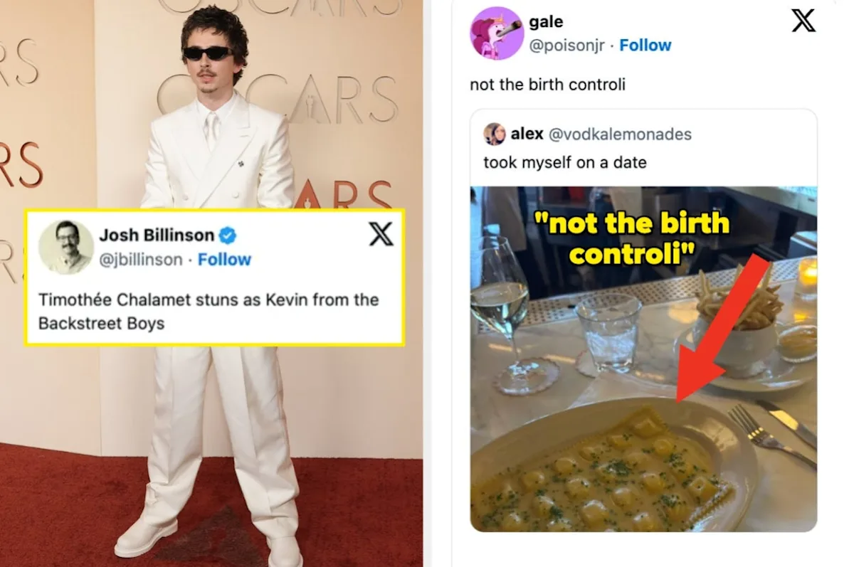 The tweet jokingly compared Timothée Chalamet's Oscars outfit to Backstreet Boys' Kevin. The picture shows Chalamet wearing a white suit