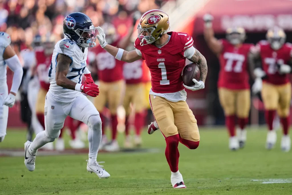 Pearsall had his best game since returning from a knee injury in the win over the Titans, catching six passes for 96 yards. Pearsall struggled in his first three games back, with just five catches for 20 yards, but he looked to be back to his old self after getting loose on some big plays downfield last week.