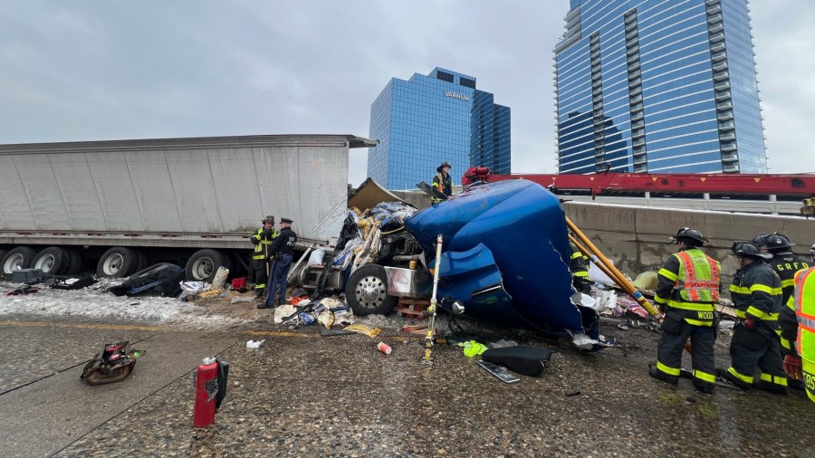 The scene of a semi-truck crash on US-131 near Interstate 196 on Dec. 2, 2025 in downtown Grand Rapids. (Courtesy of Michigan State Police)