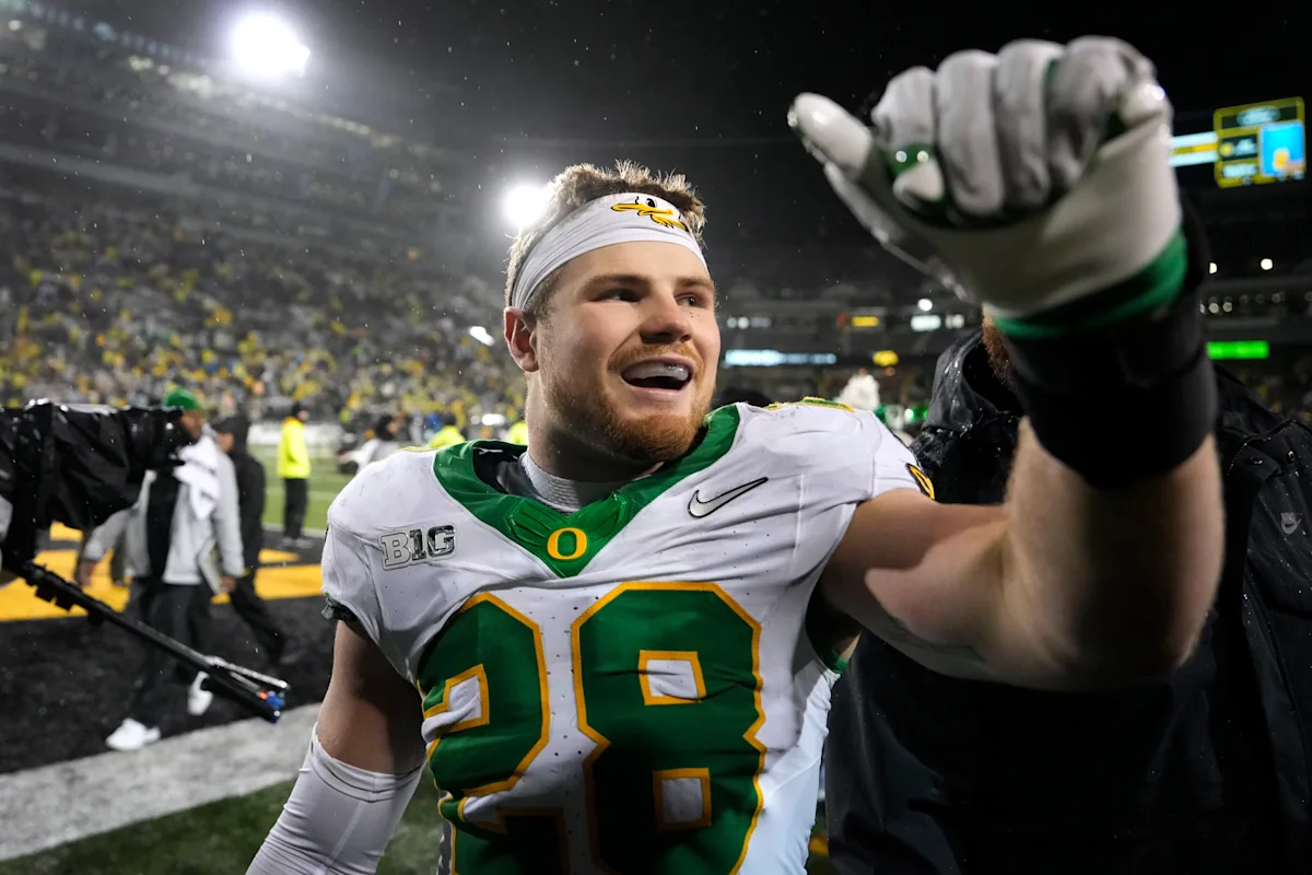 He had 12 tackles and forced a fumble in the Ducks’ 23-0 victory over Texas Tech in the CFP quarterfinals. He leads Oregon in tackles in 10 of 14 games this season. He had an interception against Northwestern earlier this year.