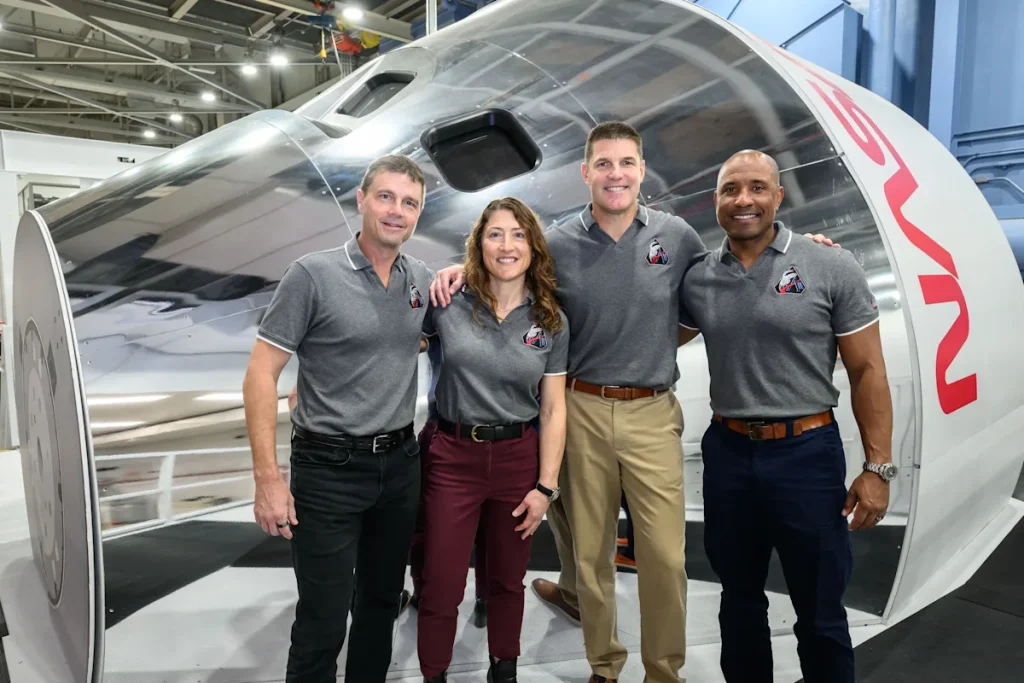 The Artemis 2 crew poses in front of the Orion simulator at NASA’s Johnson Space Center in Houston on January 23, 2026.