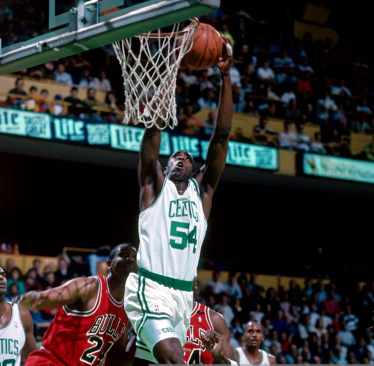 Boston, MA – 1992: Ed Pinckney #54 of the Boston Celtics dunks against the Chicago Bulls during a 1992 game at the Boston Garden in Boston, Massachusetts. Notice to User: User expressly acknowledges and agrees that by downloading and/or using this photo, User agrees to the terms and conditions of the Getty Images License Agreement. Mandatory Copyright Notice: Copyright 1992 NBAE (Photo by Dick Raphael/NBAE via Getty Images)