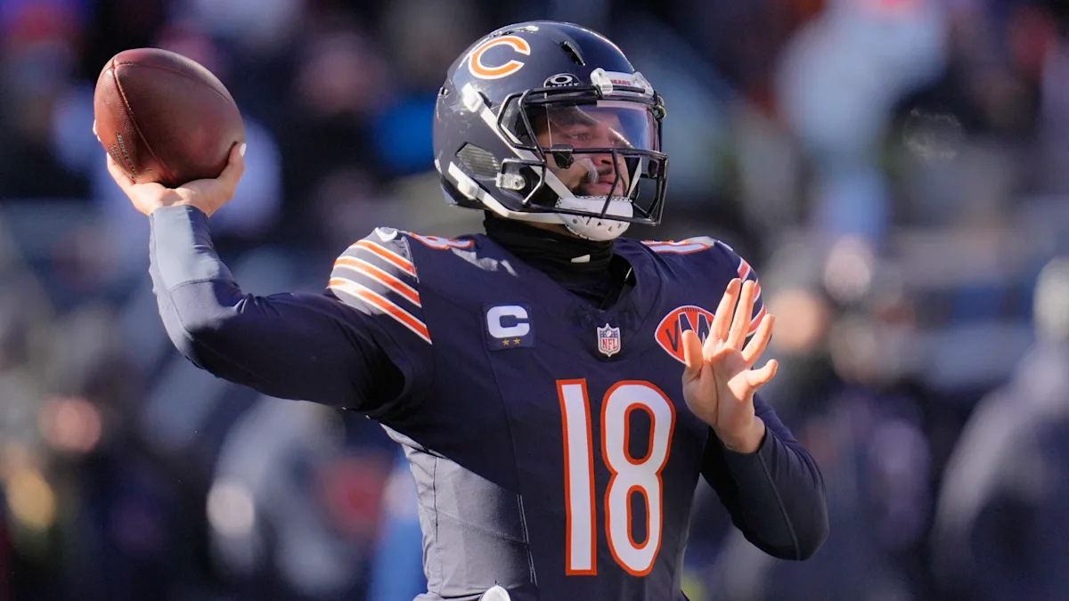 Chicago Bears quarterback Caleb Williams (18) throws a pass during the first half of an NFL football game against the Cleveland Browns on Sunday, December 14, 2025, in Chicago. (AP Photo/Erin Hooley)