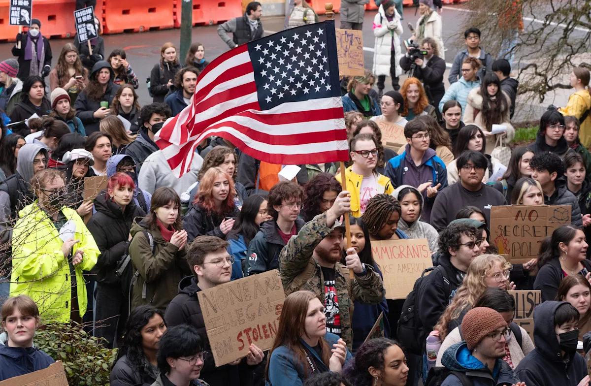 Protesters gather at Johnson Hall on the University of Oregon campus in Eugene to celebrate “A Day Without Immigrants” on February 16, 2026