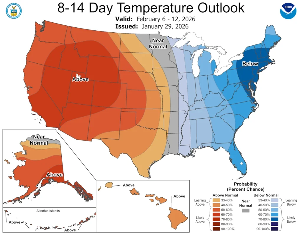 A map from the National Oceanic and Atmospheric Administration’s Climate Prediction Center (below) shows that the eastern United States will remain cold for much of the month, while the west will remain warm.