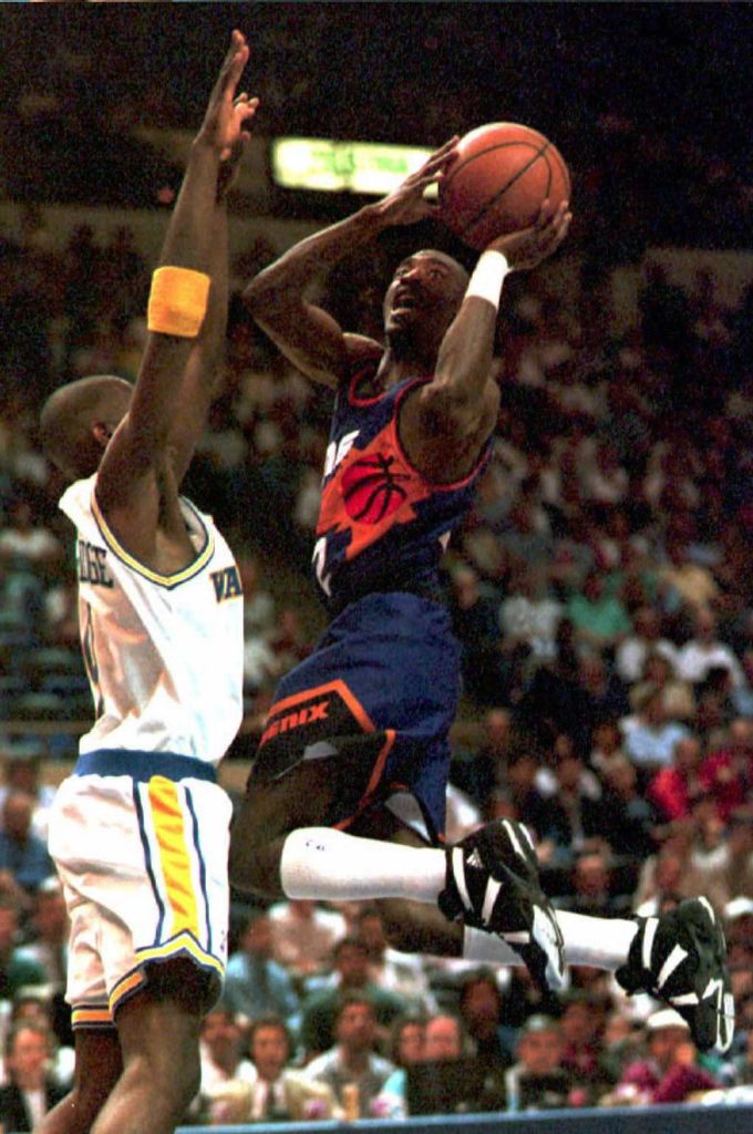 Oakland, Phoenix Suns’ Elliott Perry (right) attempts a shot while Golden State Warriors’ Ryan Lothridge defends during the first quarter of a game in Oakland on April 4, 1995. The Warriors defeated the Suns 122-114. AFP photo (Photo credit should be JOHN G. MABANGLO/AFP via Getty Images)