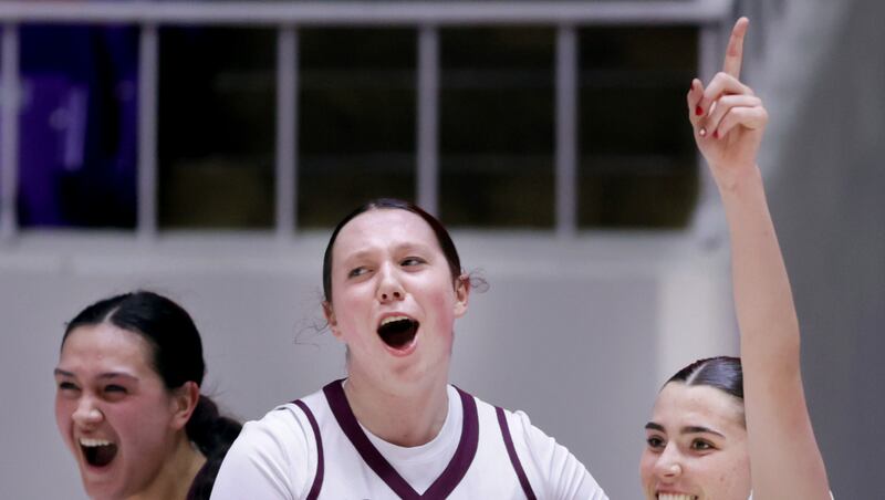 Pine View’s Ella Fiefia (left), Kenedy Eves and Reese Gustin celebrate a win over Mountain Crest in the quarterfinals of the 4A girls basketball state tournament on Wednesday, Feb. 18, 2026, at the Dee Events Center in Ogden. Laura Seitz, Deseret News