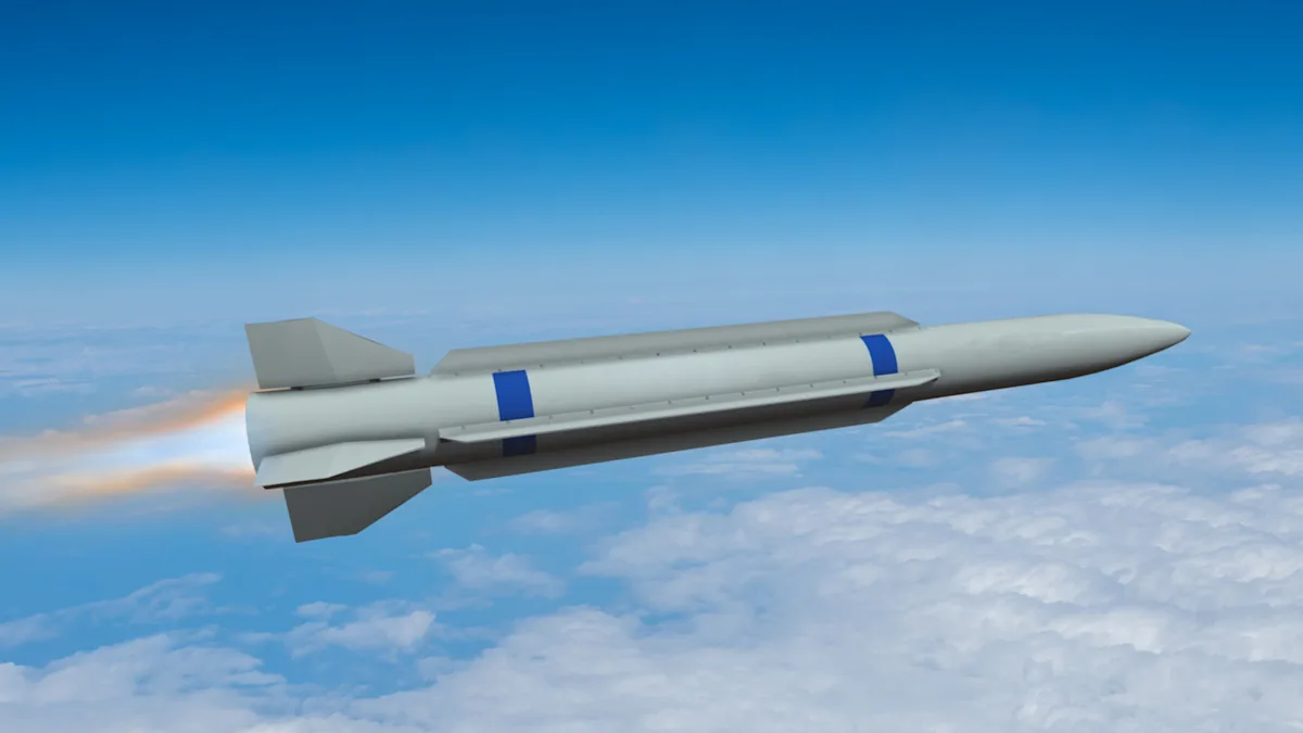 A metallic hypersonic missile with red accents flies above the clouds – Alexyz3d/Getty Images