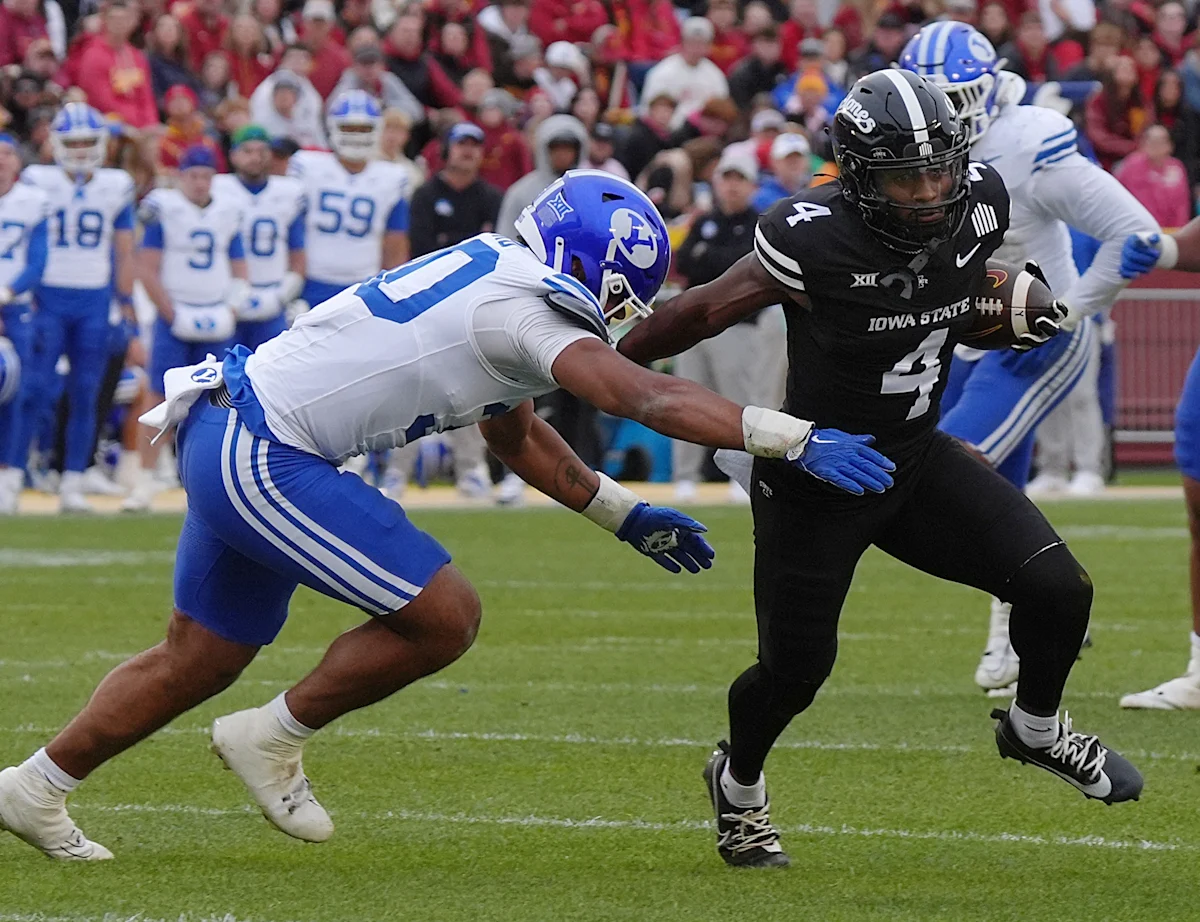 Iowa State Cyclones wide receiver Xavier Townsend (4) breaks the tackle of BYU Cougars linebacker Max Alford (30) while scrambling for a first down after receiving the ball in the first quarter at Jack Trice Stadium on October 25, 2025 in Ames, Iowa.
