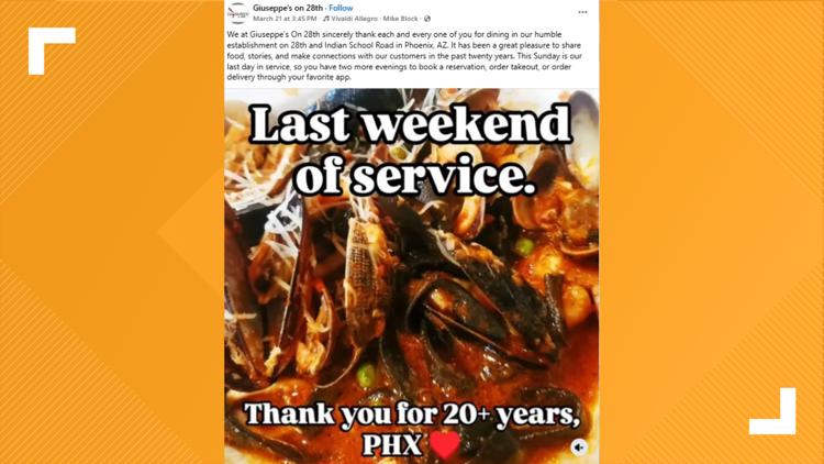 Giuseppe’s on 28th in Phoenix has officially closed its doors after its last day of business on March 22. This authentic little Italian restaurant has been a local favorite for over 20 years.