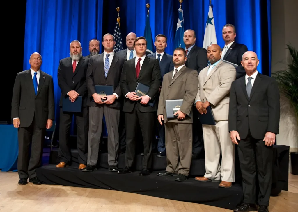 Samuel L. Saxon, pictured in the front row wearing glasses and a red tie, was awarded the Secretary of State’s Meritorious Service Medal in 2016 for his contributions to the Department of Homeland Security.