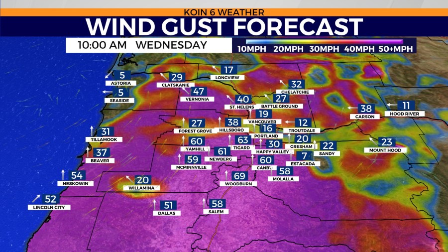 If the storm track is close enough to the coastline, brief southerly wind gusts could reach 60 mph in parts of the Portland metro area. Wind times look to be concentrated early morning into early evening Wednesday.