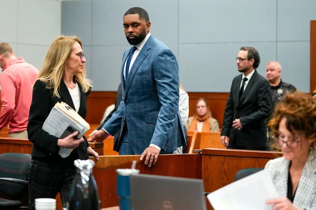 Moore returned to an Ann Arbor courthouse on Tuesday, Feb. 17 to argue in support of their motion to toss the case. Wearing a blue suit, Moore identified himself in court but did not give a statement before or after the hearing. His wife did not join him in court this week, although she accompanied him to his hearing in January.