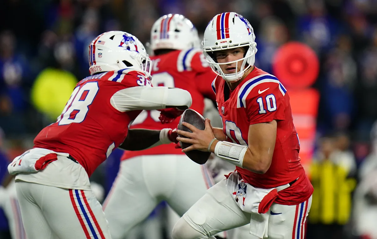 Dec 1, 2025; Foxborough, Massachusetts, USA; New England Patriots quarterback Drake Maye (10) fakes a hand off during the fourth quarter against the New York Giants at Gillette Stadium. Mandatory Credit: David Butler II-Imagn Images