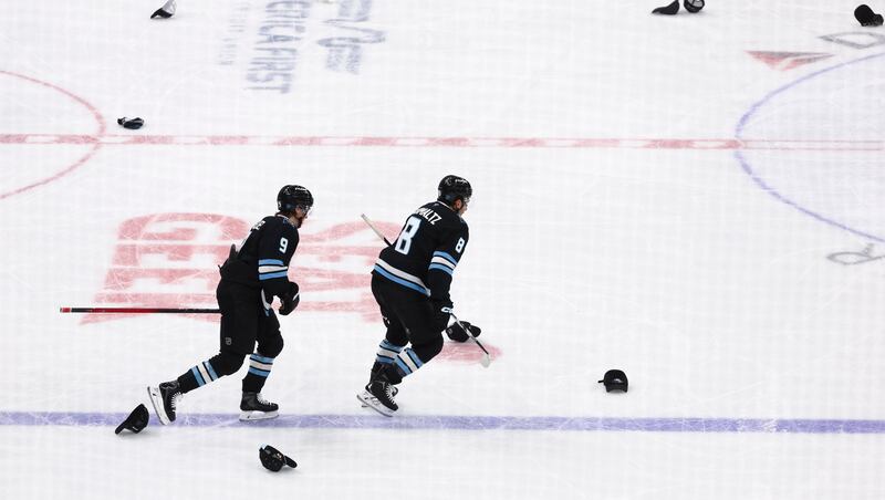 Utah Mammoth center Nick Schmaltz (8) and right wing Clayton Keller (9) skate through a sea of hats that were been thrown onto ice after Schmaltz scored his third goal of the game during the third period of an NHL game against the Vancouver Canucks at the Delta Center in Salt Lake City on Monday, Feb. 2, 2026. | Rio Giancarlo, Deseret News