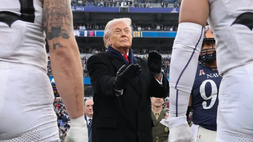 President Donald Trump tosses a coin before the Army-Navy game on Dec. 13, 2025 in Baltimore, Maryland. /ALEX WROBLEWSKI/AFP/Getty Images