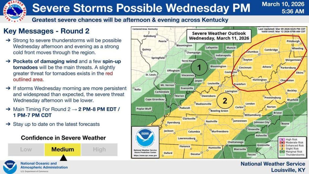 Two rounds of severe storms are expected in Kentucky on Wednesday, according to the National Weather Service.