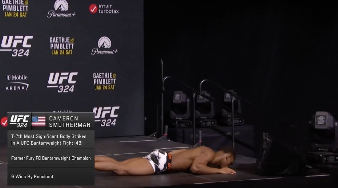 Cameron Smotherman stepped off the scale and faced the stage after weighing in for his bantamweight bout with Ricky Turcios at the UFC 324 weigh-ins on Friday morning. Smotherman lay on the ground for several minutes while paramedics arrived to help.