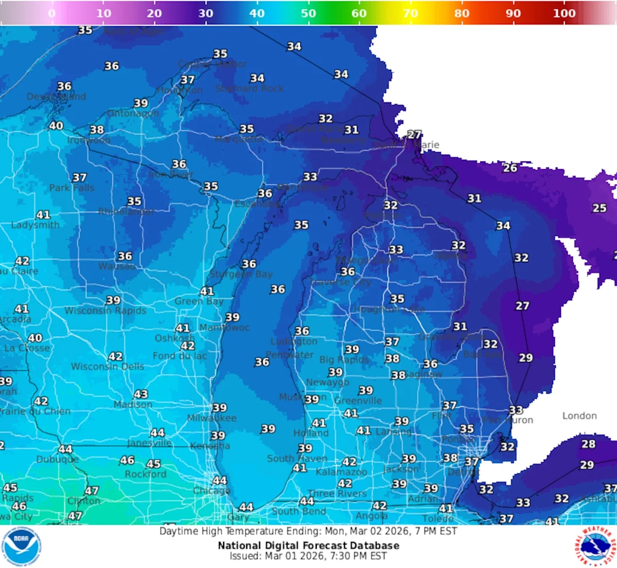 The high pressure currently over the Great Lakes will shift eastward on Monday, allowing southwesterly winds to bring warm air into Michigan. Temperatures on Monday will be in the mid-20s to near 40 degrees in the west and central areas, with temperatures in the 30s in the east. The warming trend is accelerating this week, with highs in the 40s on Tuesday and Wednesday, and then by Friday, temperatures will hit the 50s and possibly the 60s across southern Lower Michigan.