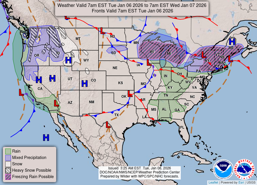 The national weather forecast map for Tuesday, January 6, shows an outbreak of freezing rain across the upper Great Lakes and Northeast.