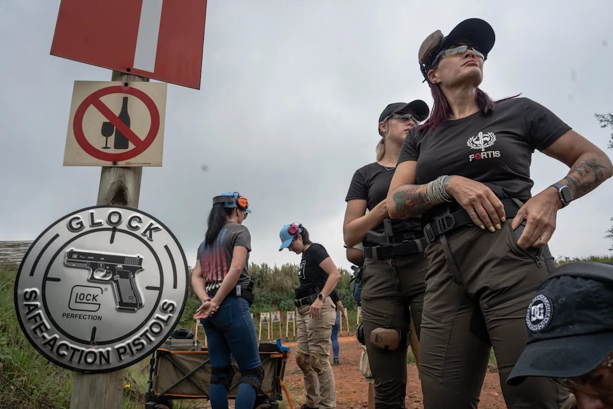 “Check your grip, check your sight,” yells Claire van der Westhuizen, the lead female instructor at the Lone Operator Range, as the woman with manicured nails reloads for another round.